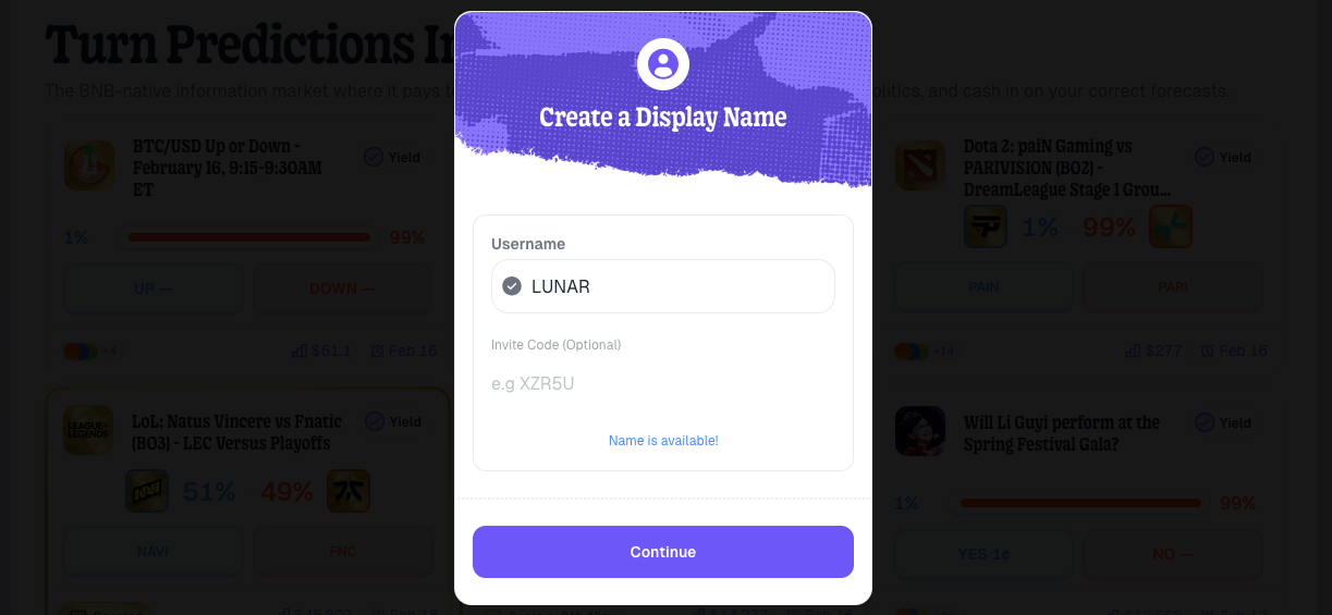 Head over to predict.fun and click Sign Up in the top right corner. Next, select Continue with a wallet.