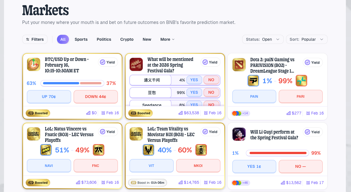 Browse the available selection on the Markets page. The easiest way to participate is by clicking your preferred side on a card, and buying $5 worth of your preferred side.